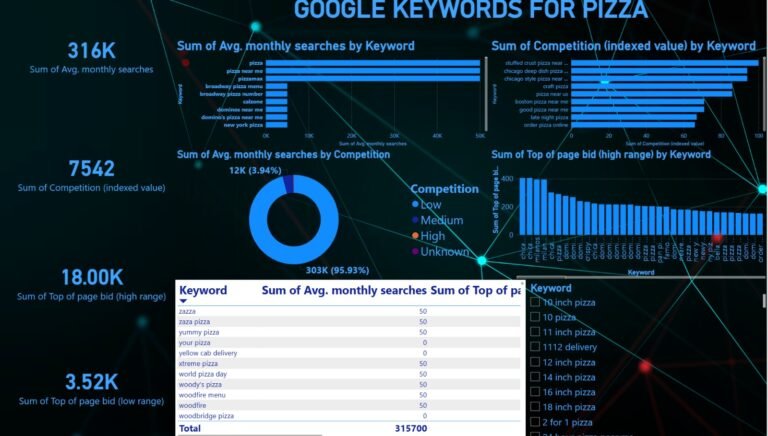 The Google Keywords dashboard for “Pizza” reveals a high-volume market dominated by local intent and massive brand loyalty, primarily toward Pizzamax and Broadway Pizza. With 316K total monthly searches and a staggering 95.9% of that traffic categorized as “Low Competition,” there is a golden opportunity to capture “near me” traffic without needing an enormous ad budget. While broad terms like “pizza” and “pizza near me” lead in volume, the highest “Top of Page” bids are surprisingly concentrated on niche or specific styles like Chicago Deep Dish, suggesting that specialized pizza offerings are where the most aggressive bidding wars occur.